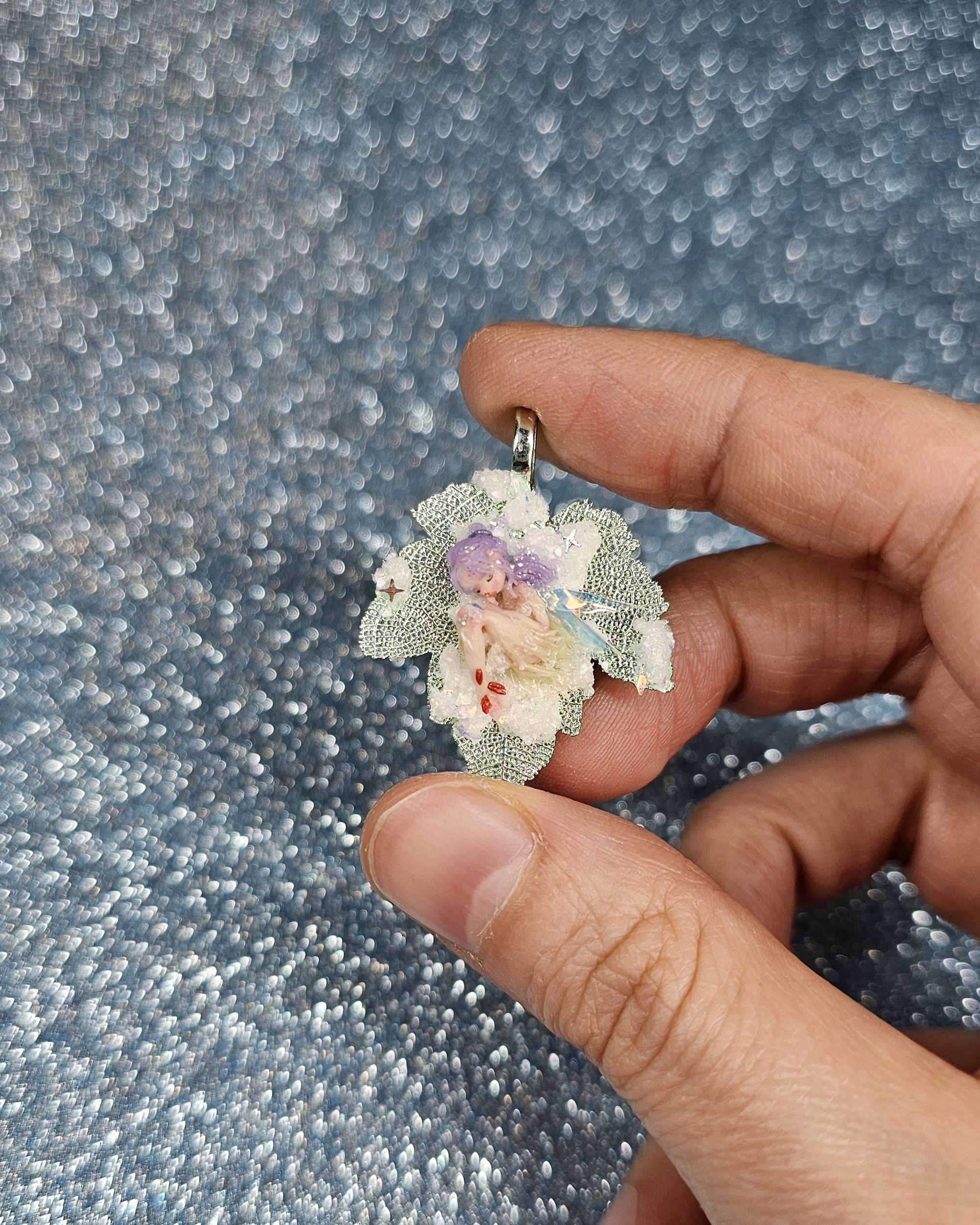 Creazione realizzata su base in metallo. Personaggio e decorazioni modellati a mano in argilla polimerica e mixed media.