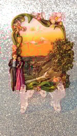 Materials: Polyurethane resin frame painted with acrylics, landscape and figures in polymer clay.