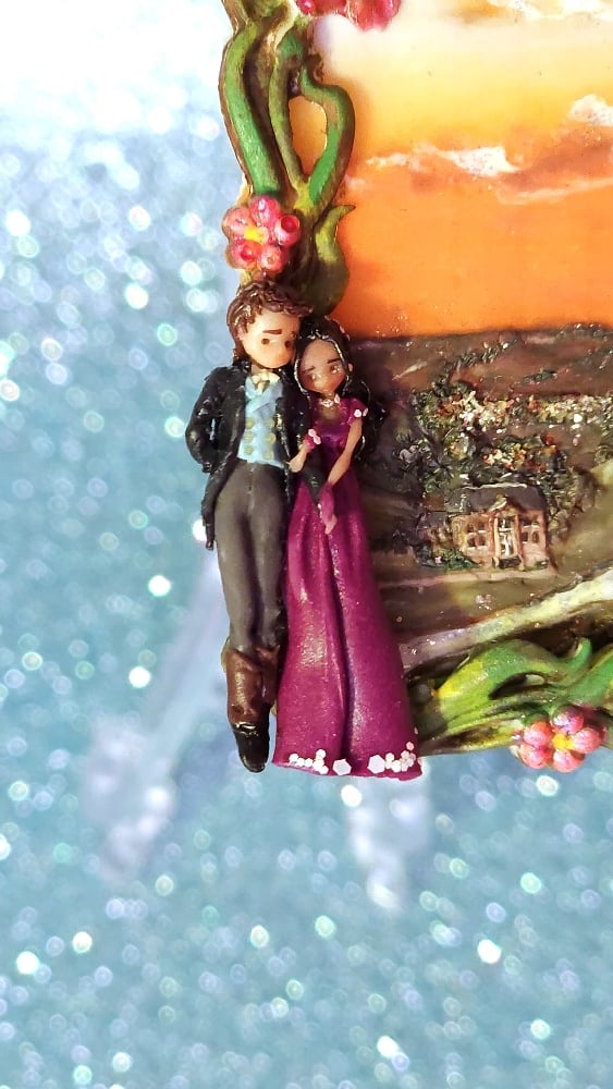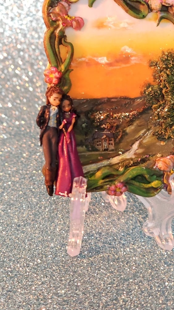 A miniature masterpiece created entirely by hand that captures the essence of one of the most beloved love stories. This frame is a fan art dedicated to Anthony and Kate from the Bridgerton series. The English countryside landscape has been meticulously modeled in polymer clay, creating a vivid and three-dimensional scene enclosed within a decorated frame.