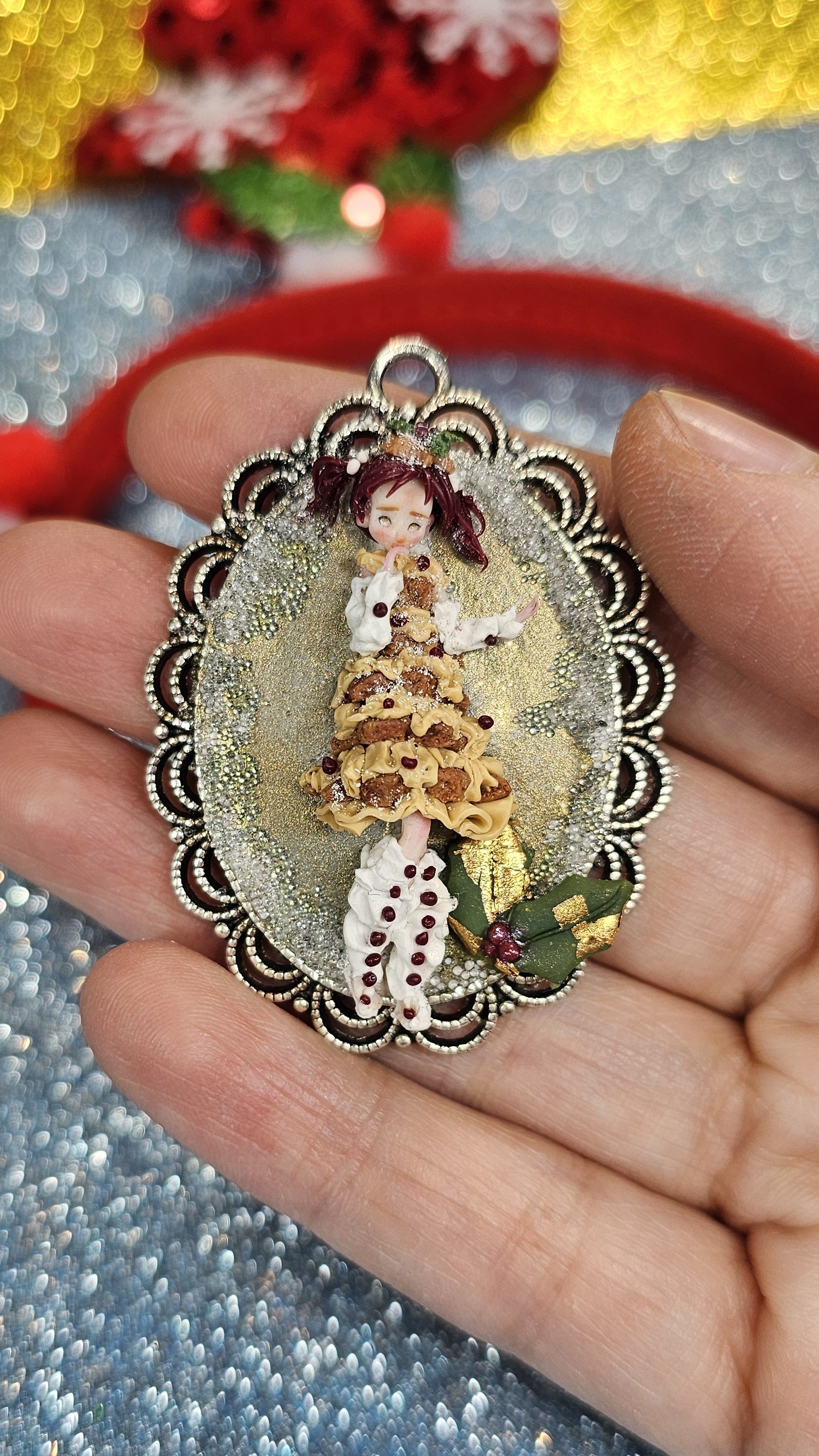 Sweetest polymer clay pendant on metal base. You can decide to wear it or hang it on the tree.