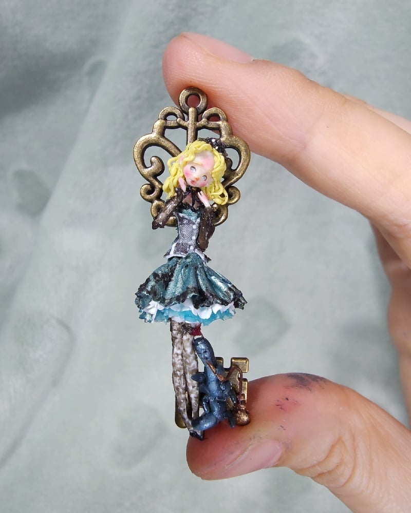 Creazione realizzata su base in metallo. Personaggio e decorazioni modellati a mano in argilla polimerica.