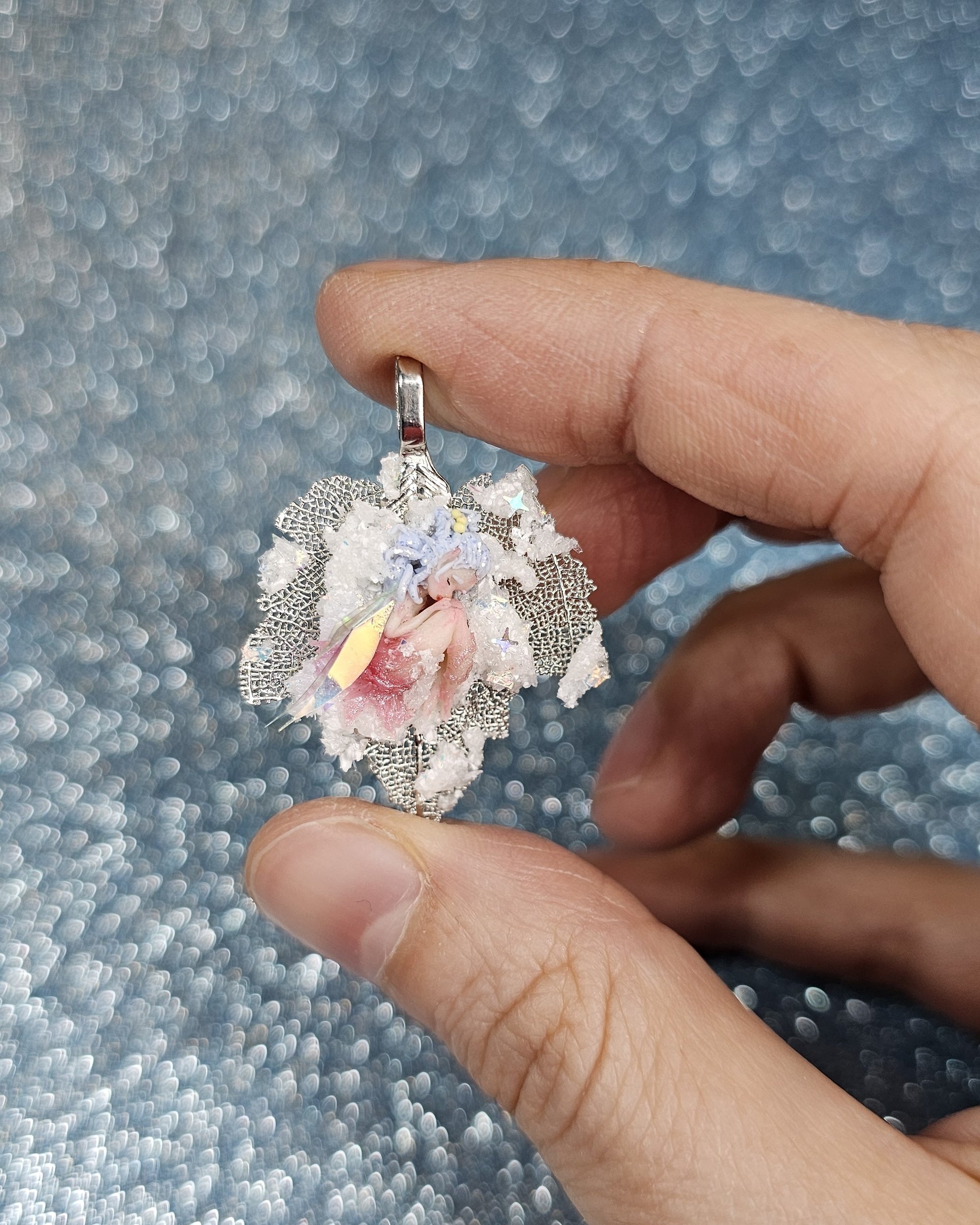 Creation made on metal base. Character and decorations hand-shaped in polymer clay and mixed media.